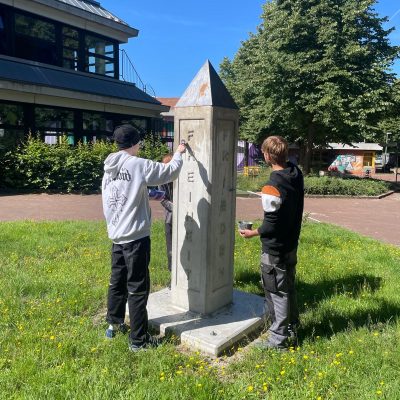 Entstanden ist der Pfahl durch die Zusammenarbeit von Metall-, Holz und Bautechnik. Unsere Politik- und Religionsteam organisierte den Friedenstag und einen gemeinsamen Friedensgang. Zahlreiche Klassen und Lehrkräfte steuerten tolle Aktionen bei und die Schulband sorgte für eine entsprechende Stimmung, die Sprachlernklassen pflanzten Blumen.