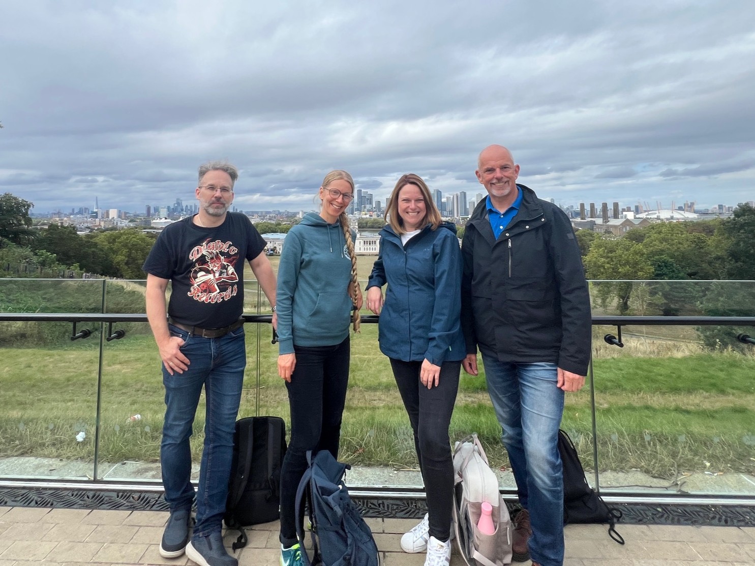 Anschließend traf sich die Reisegruppe in North-Greenwich, von wo aus man den Hügel zum Observatorium und dem Greenwich Meridian erklomm. Besonderes Highlight hierbei war wie immer das Gruppenfoto vor der Skyline Londons (mit royaler Beteiligung 😉, welche die Reise für alle Teilnehmer unvergesslich machte.