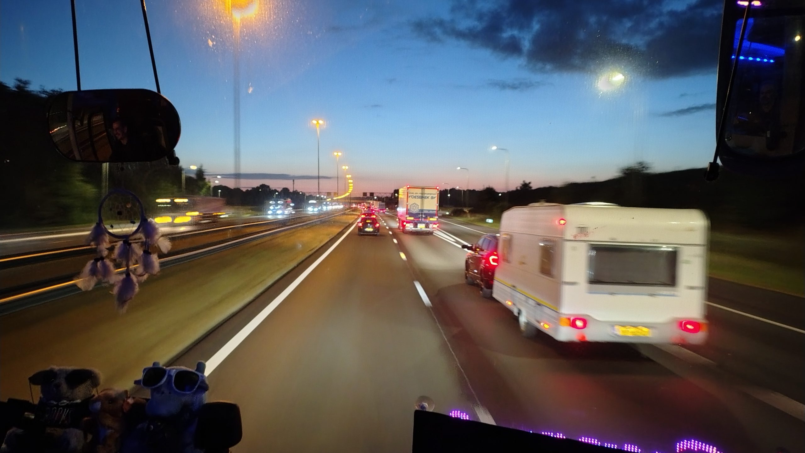 Die Abreise von der Messestraße an den Weser-Ems-Hallen erfolgte am frühen Samstagabend bequem mit dem Bus „Gargamel“ der (sehr empfehlenswerten) Firma Artal Reisen und führte dann durch Holland, Belgien und Frankreich zur Fähre von Calais nach Dover.