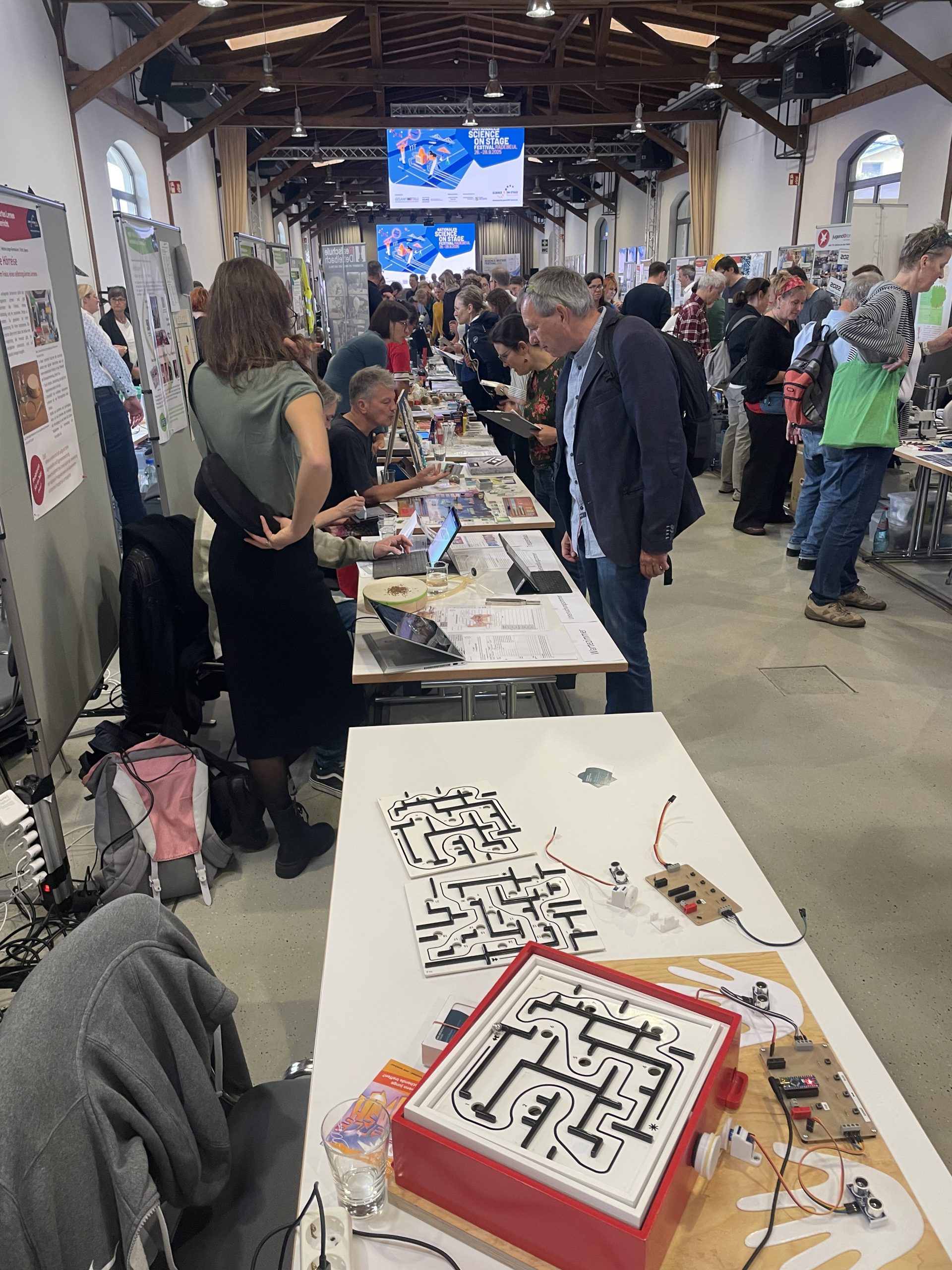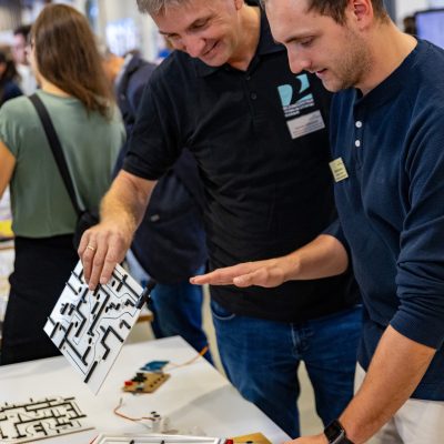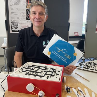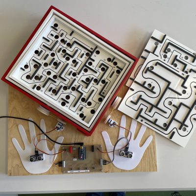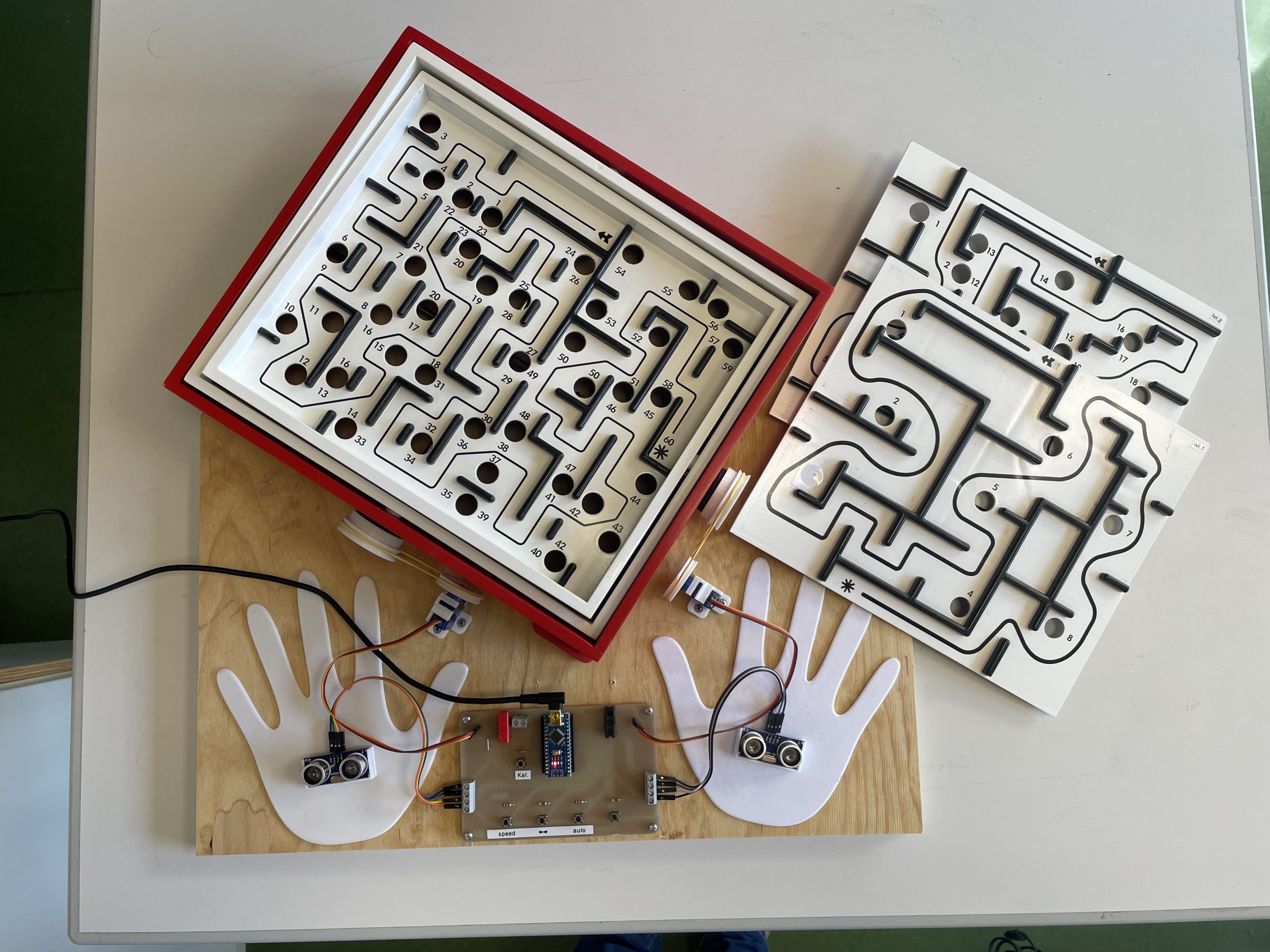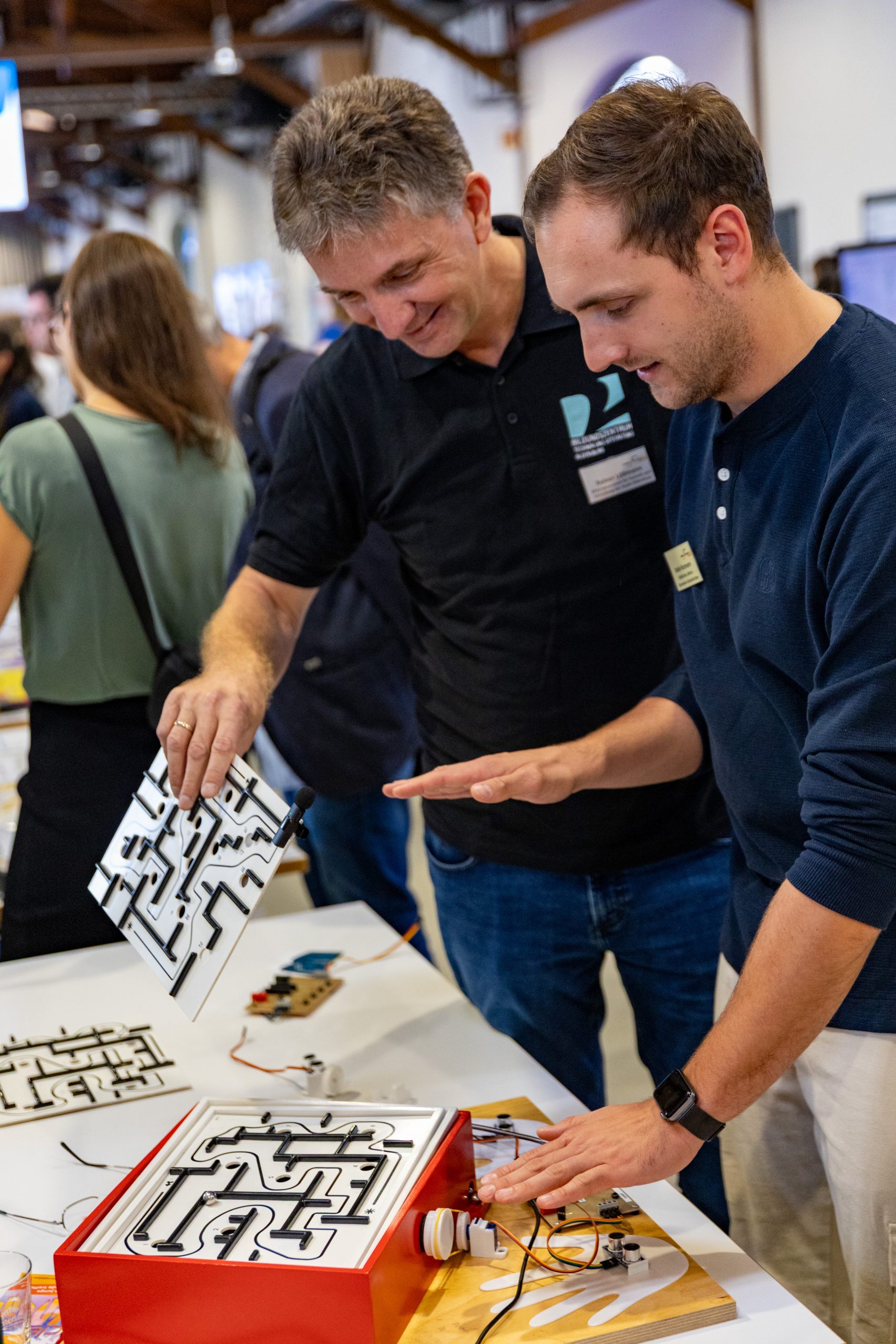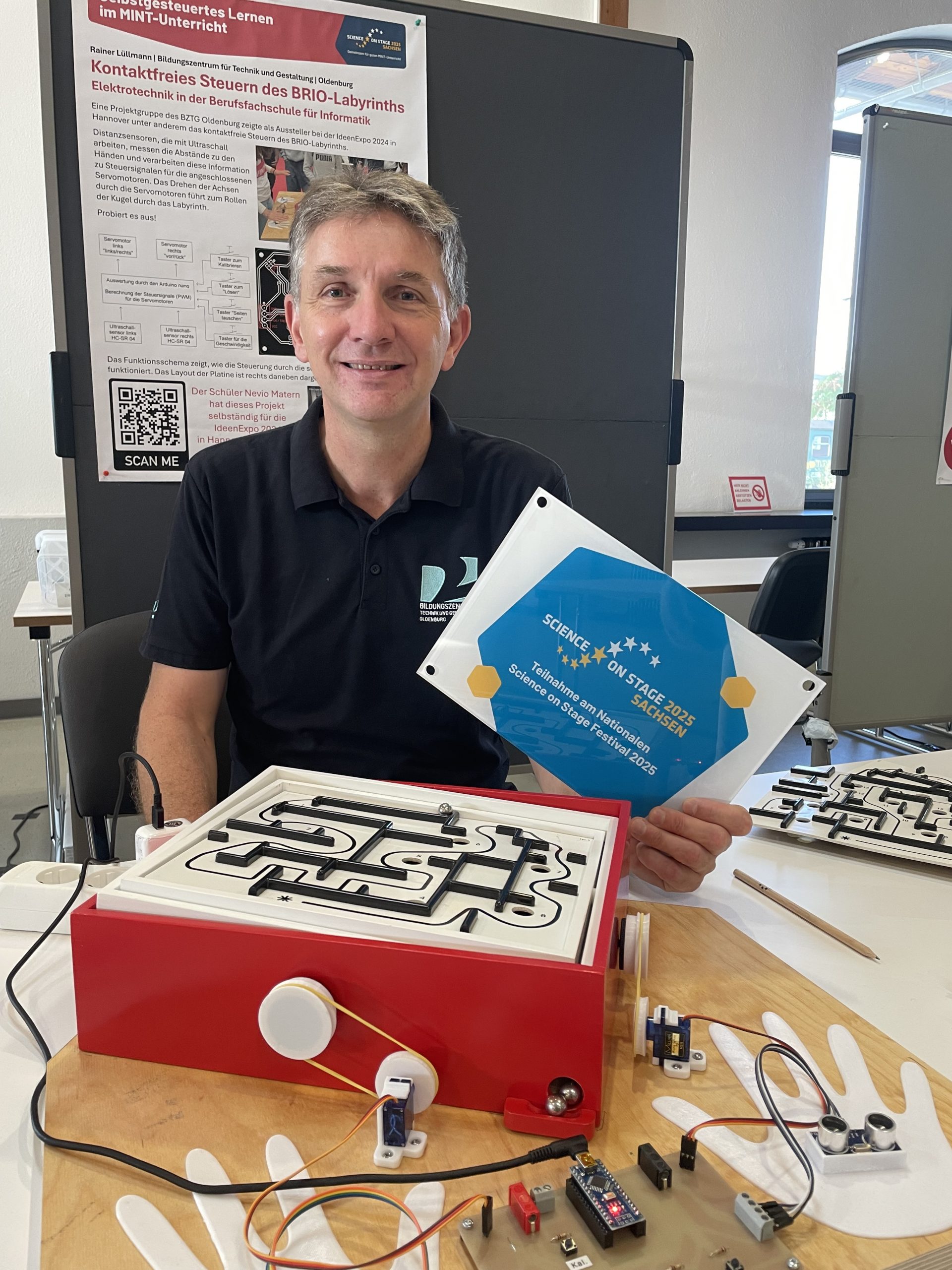 Rainer Lüllmann , Lehrer des BZTG für Elektrotechnik, Mathematik und Informatik, stellte das innovative Projekt „Kontaktfreies Steuern des BRIO-Labyrinths“ vor. Dieses Projekt wurde maßgeblich von Nevio Matern entwickelt, der bis zum Sommer Schüler an der Berufsfachschule für Informatik am BZTG Oldenburg war. Bei diesem spannenden Experiment steuern die Teilnehmer das Rollen einer Kugel durch ein Labyrinth, indem sie ihre Hände über zwei Distanzsensoren heben und senken.
