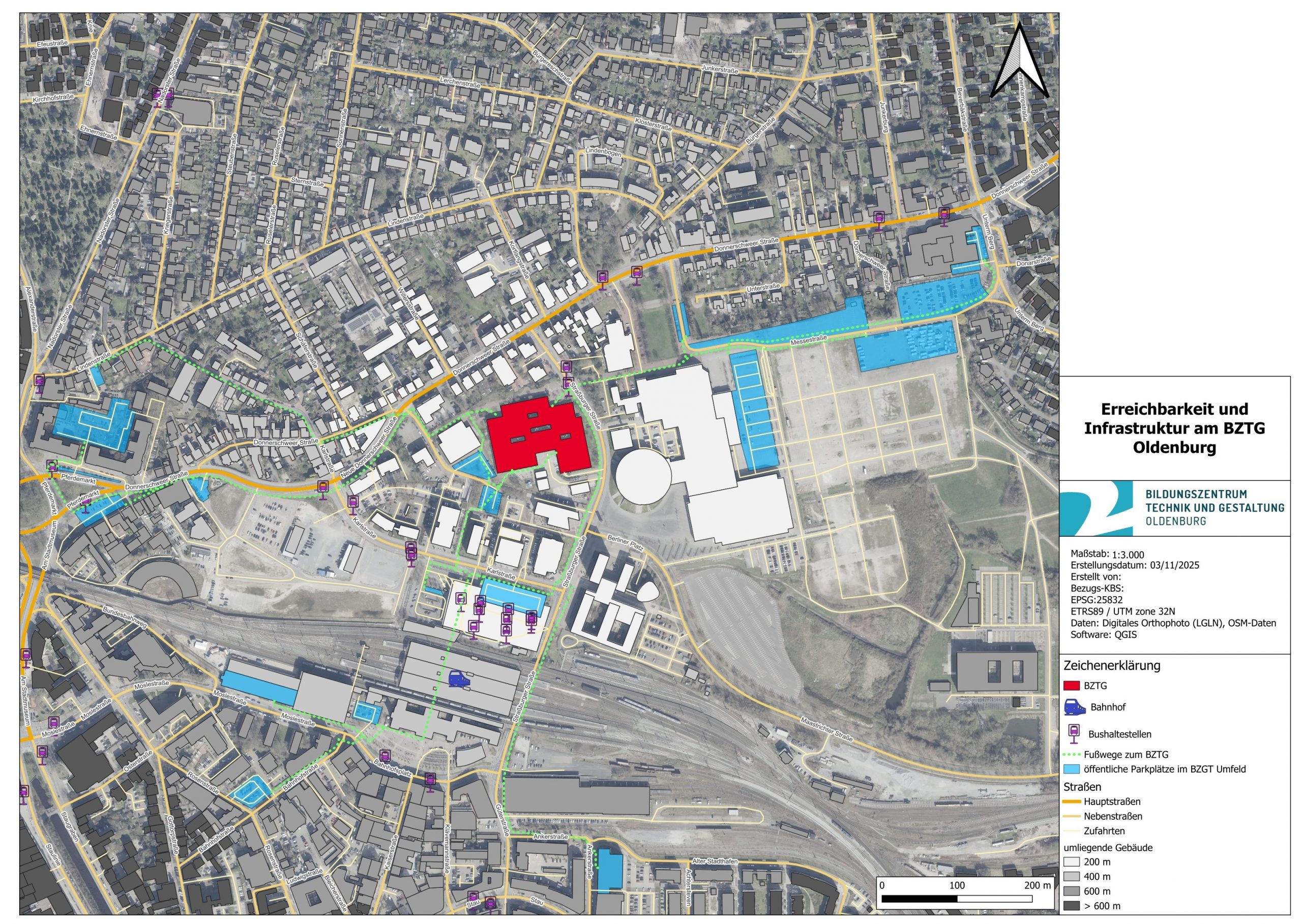 Die Erstellung einer interaktiven Webkarte zum Thema „Sport in Oldenburg“ zeigt, wie Geodaten und digitale Kartografie im Alltag angewendet werden können. Die Auszubildenden führten außerdem eine Potentialanalyse zur Schaffung zusätzlicher Sitzgelegenheiten an unserer Schule durch, um die Aufenthaltsqualität zu verbessern.