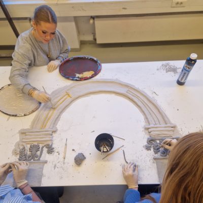 Die Klasse beschäftigte sich intensiv mit den charakteristischen Merkmalen der jeweiligen Epochen. Dabei lag der Schwerpunkt auf der Auswahl von Farben und Ornamenten, die typisch für die verschiedenen Stile sind. Jede Epoche bringt ihre eigenen ästhetischen Elemente mit sich, die es zu berücksichtigen galt, um eine authentische und ansprechende Wandgestaltungen zu entwickeln.