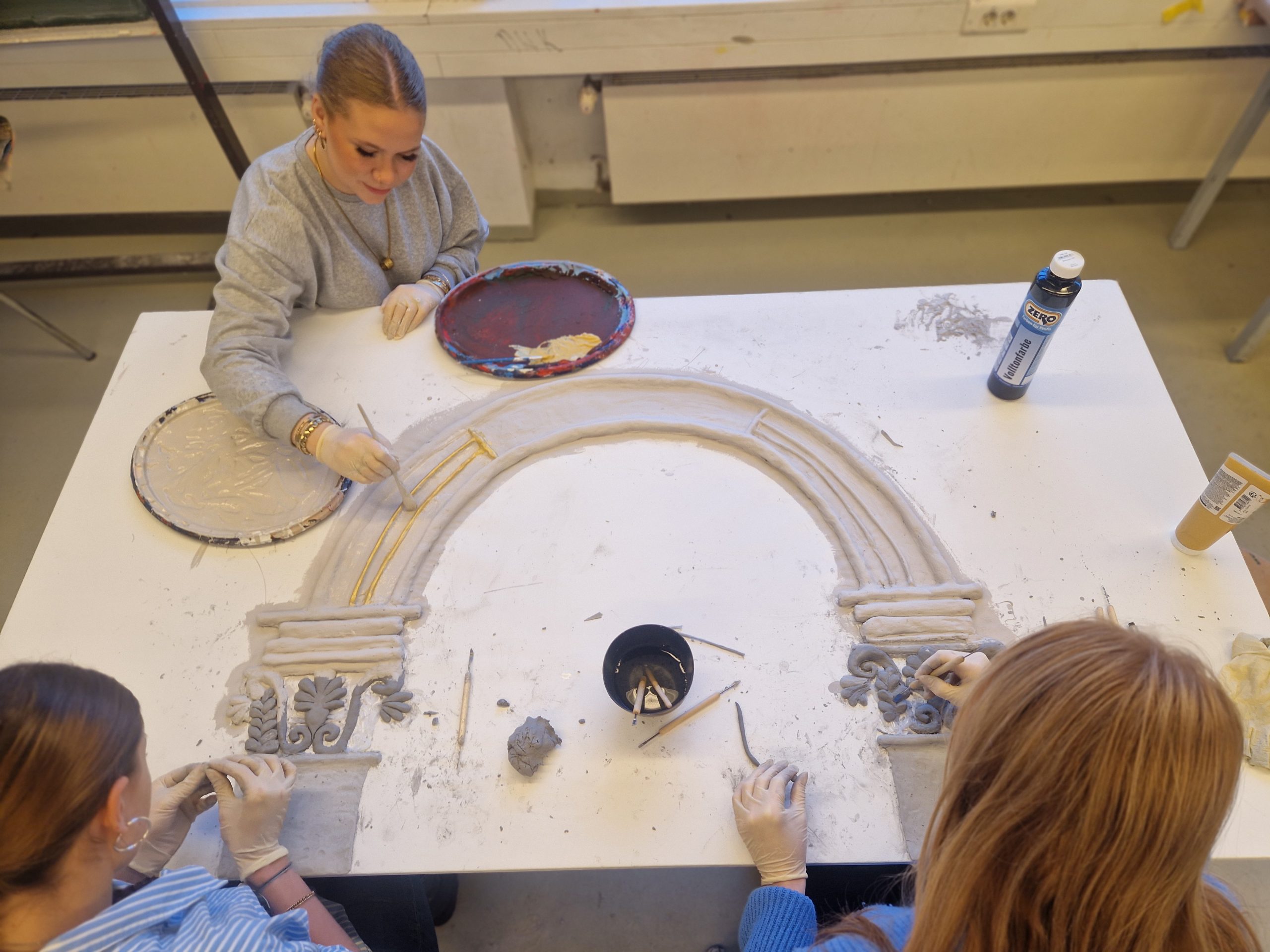 Die Klasse beschäftigte sich intensiv mit den charakteristischen Merkmalen der jeweiligen Epochen. Dabei lag der Schwerpunkt auf der Auswahl von Farben und Ornamenten, die typisch für die verschiedenen Stile sind. Jede Epoche bringt ihre eigenen ästhetischen Elemente mit sich, die es zu berücksichtigen galt, um eine authentische und ansprechende Wandgestaltungen zu entwickeln.
