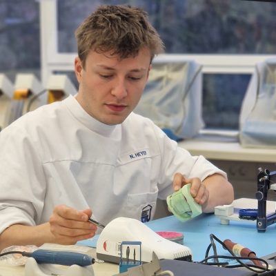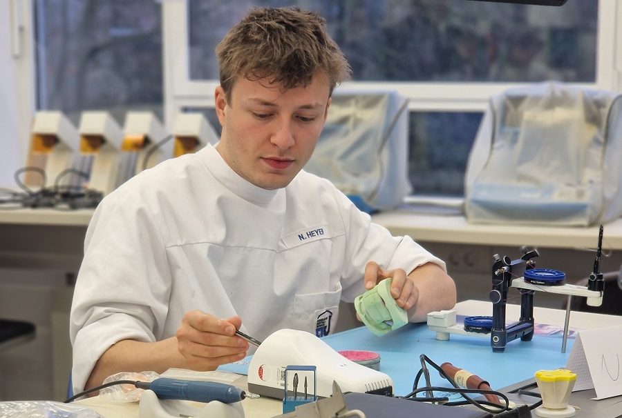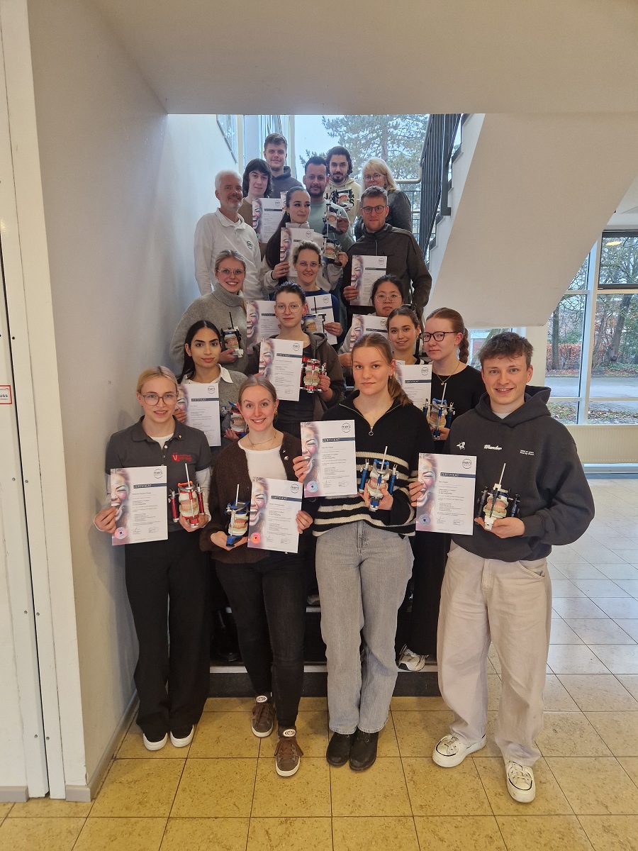 Die Klasse SZA23 hat vom 11.02. – 12.02. an einem Kurs über die Totalprotethik In Funktion, referiert von Herrn Theiling, teilgenommen. Begonnen wurde mit einer klassischen aber dennoch recht bunten Modellanalyse, anhand welcher man ermittelt, wo ehemalige Zähne vorher gestanden haben. Das Ziel von TIF ist es, dem Patienten die Funktion des Kauens, sowie eine neue Ästhetik und ein gesteigertes Selbstvertrauen zu geben. Motiviert wurden als erstes die Zähne des Unterkiefers aufgestellt. Voller Aufmerksamkeit hörten und schauten die Schüler: innen dem erfahrenen Referenten zu und lernten viel über die Hintergründe möglicher Fehlerquellen und dessen Vermeidung. Es folgte die Aufstellung der antagonistischen Oberkiefer Zähne in System, Ästhetik und Funktionalität. Besonders viel Spaß hatten die Schüler: innen bei der anatomischen Ausmodellation der beiden Kiefer. Hierbei werden die Wurzelwölbungen modelliert, Stützstrukturen für die Wangen nachgeahmt und eine ästhetisch ansprechende Lippenfülle erstellt. Herr Theiling brachte den Schüler: innen in voller Begeisterung für die Totalprothetik, sein Wissen und seine Erfahrung näher. Die Klasse SZA23 bedankt sich für zwei spannende und informative Kurstage.